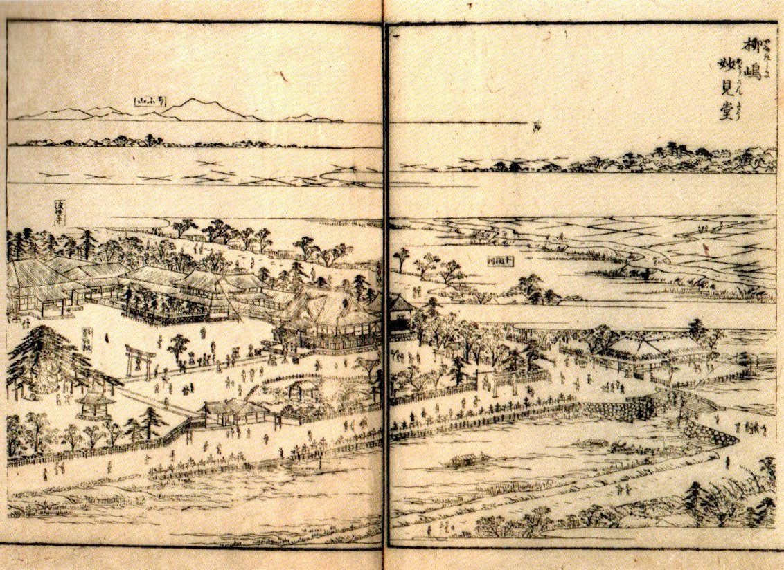 また、「江戸名所図会」巻之七(天保5〜6年・1834〜36頃、斎藤月岑他編、長谷川雪旦画、版元:須原屋茂兵衛、縦25.8×横18.1cm)で、柳島妙見堂として法性寺境内全体が描かれている。図には上部に川を十間川と記されているが、上部が北十間川の誤りで、下の流れが十間川。